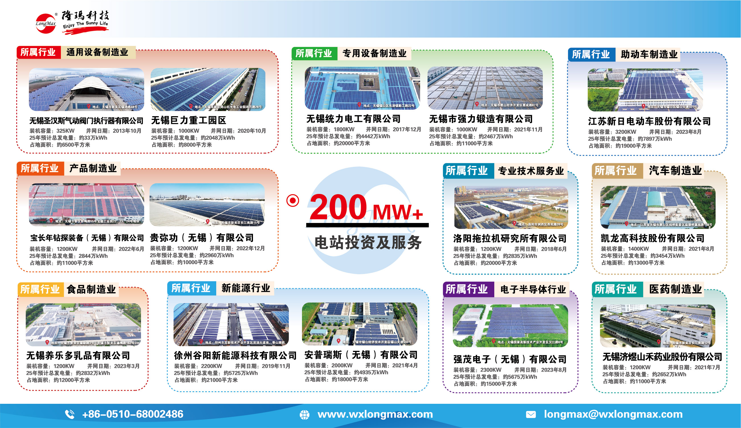 公司光伏電站累計投資建設及服務超200座,裝機總容量超200MW。先后投資建設了統力電工、新日電動車、寶長年鉆探裝備、養樂多、安普瑞斯、強茂電子、凱龍高科、濟煜山禾藥業等眾多屋頂光伏電站項目。